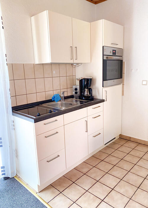 Die Küchenzeile ist hochwertig mit einem Herd, Kühlschrank, Kaffeemaschine, Wasserkocher und Toaster ausgestattet.