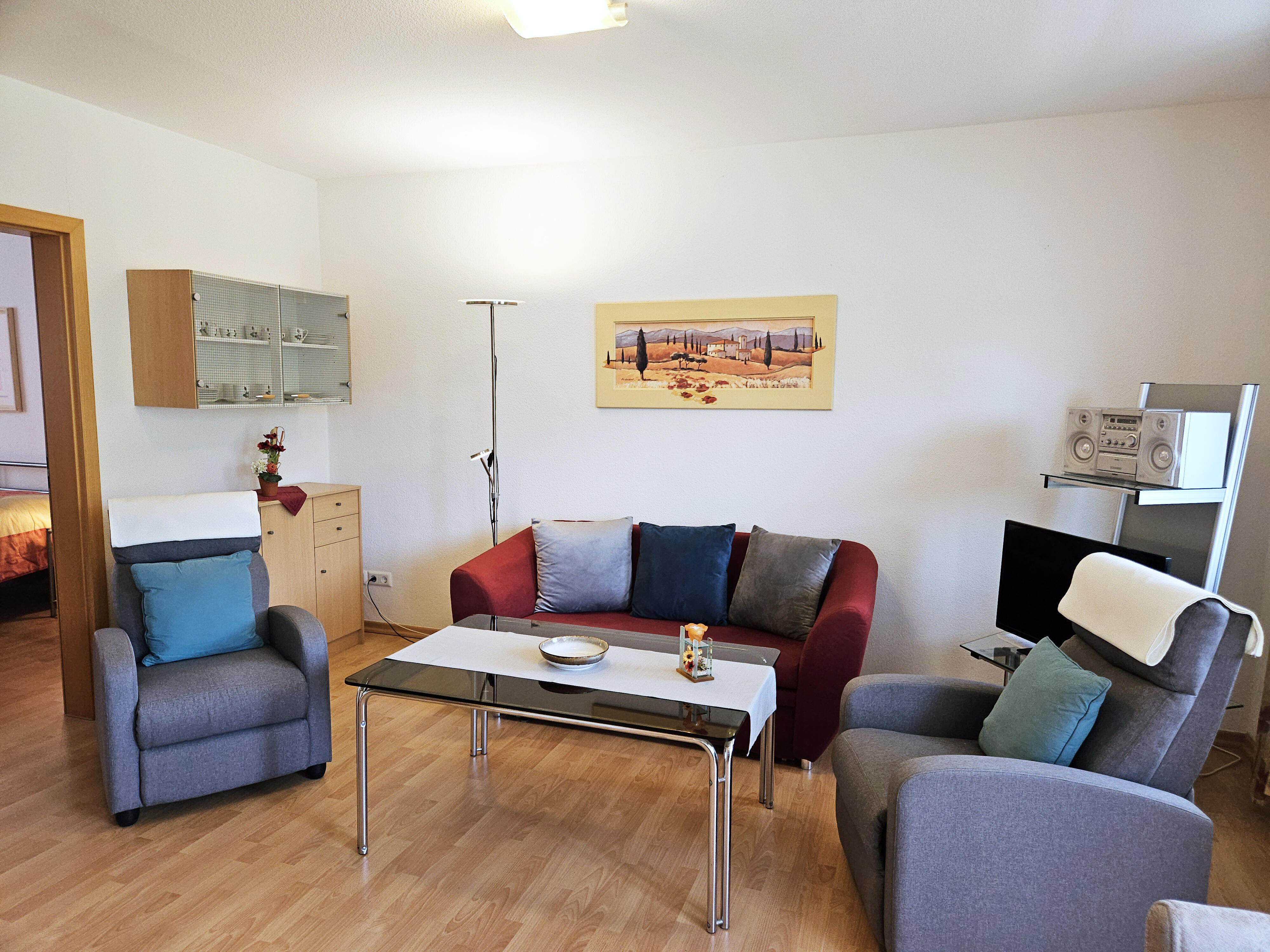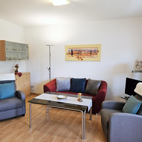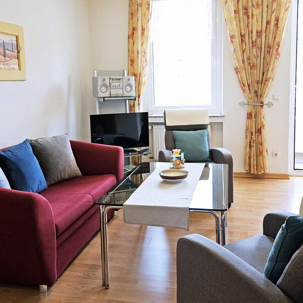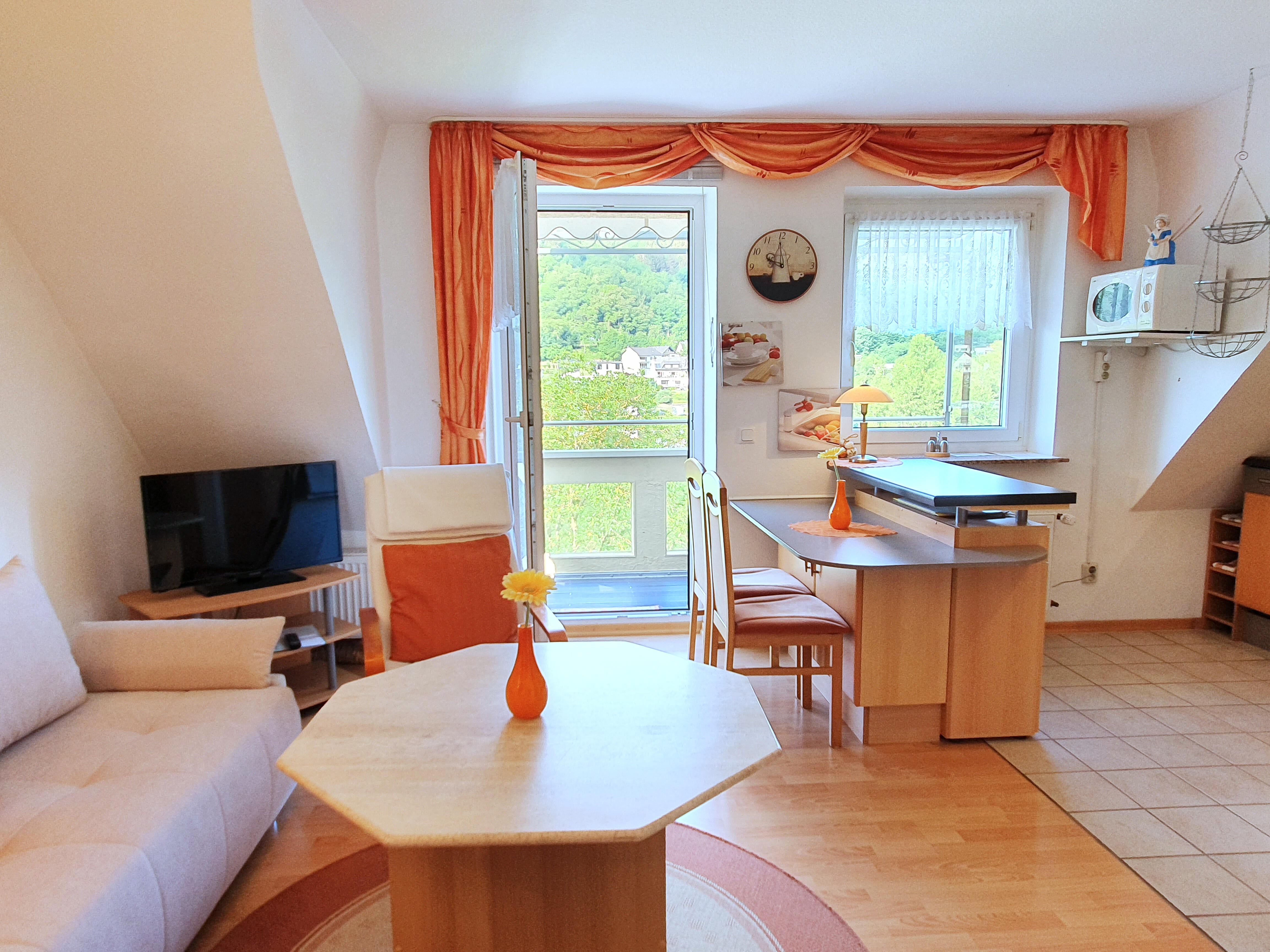Vom Balkon aus haben Sie einen herrlichen Blick auf die Mosel. Wohnraum mit Schlafcouch, 2 Relaxsessel und Sat-TV. Keine Haustiere erlaubt, Nichtraucherwohnung.