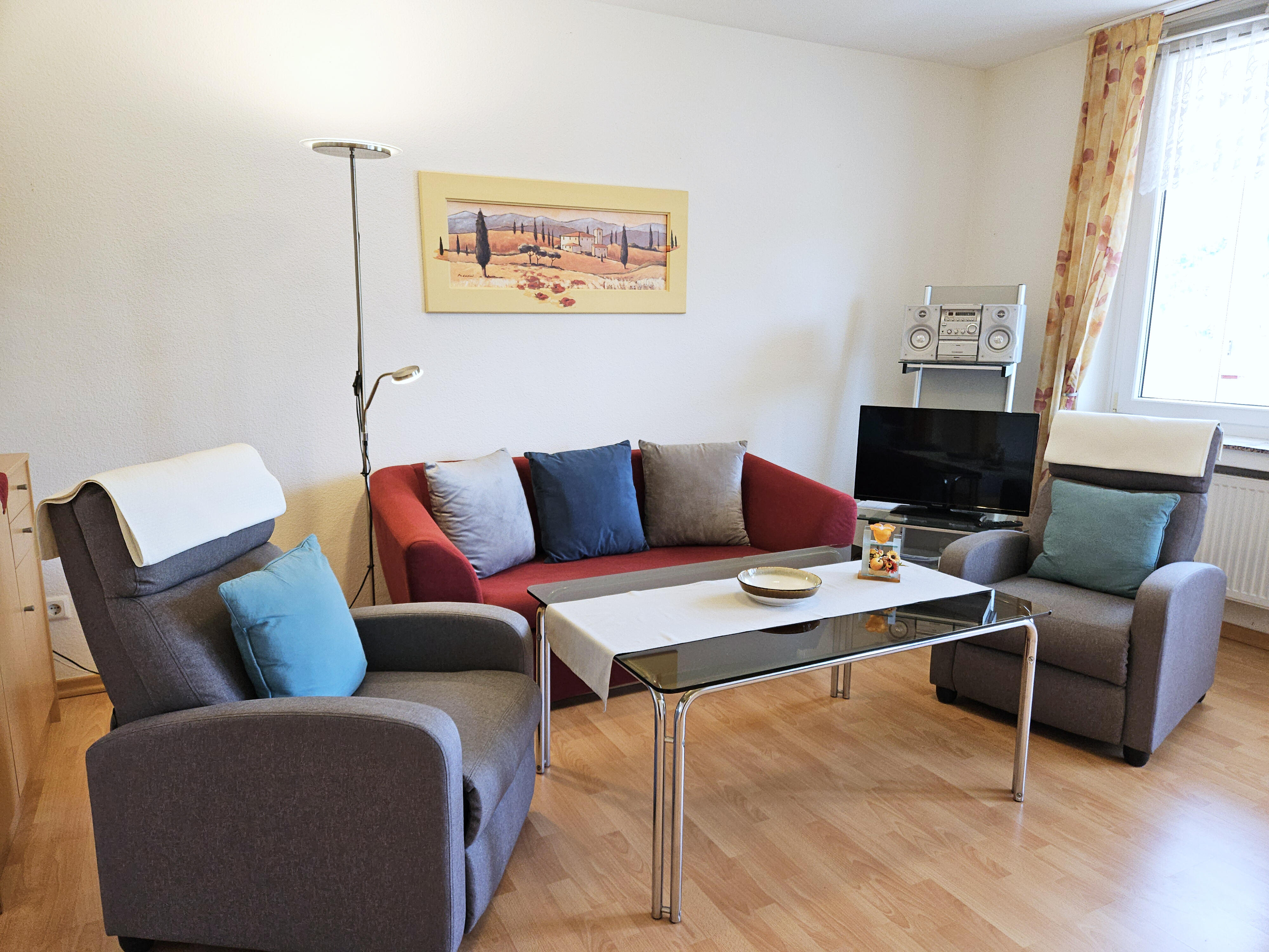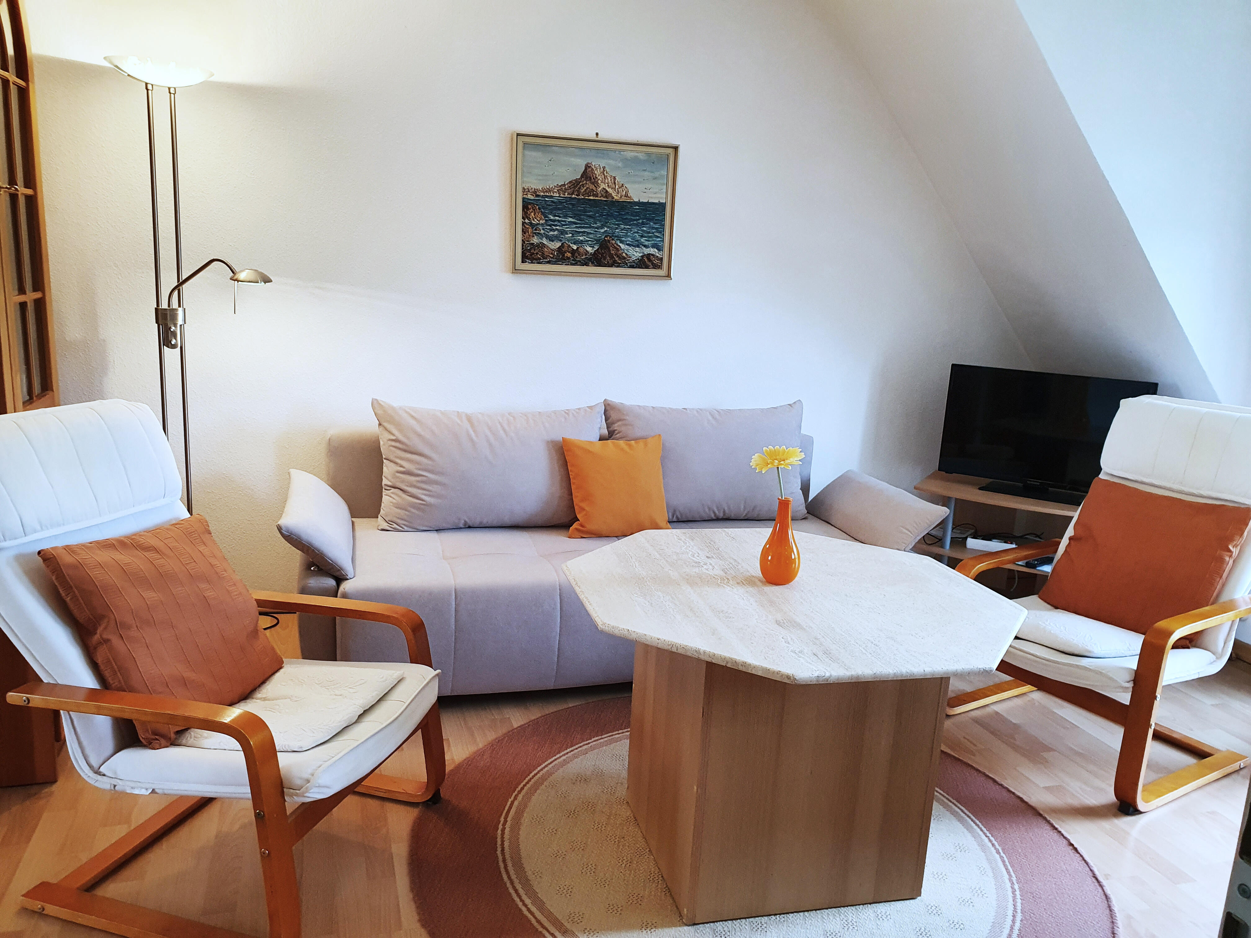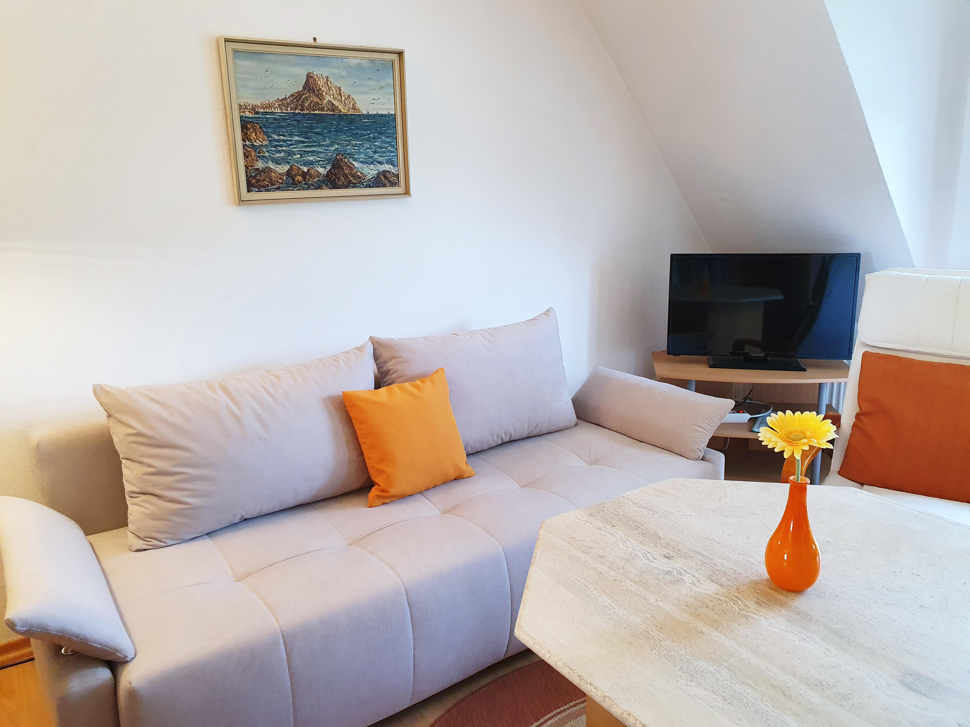 Vom Balkon aus haben Sie einen herrlichen Blick auf die Mosel. Wohnraum mit Schlafcouch, 2 Relaxsessel und Sat-TV. Keine Haustiere erlaubt, Nichtraucherwohnung.