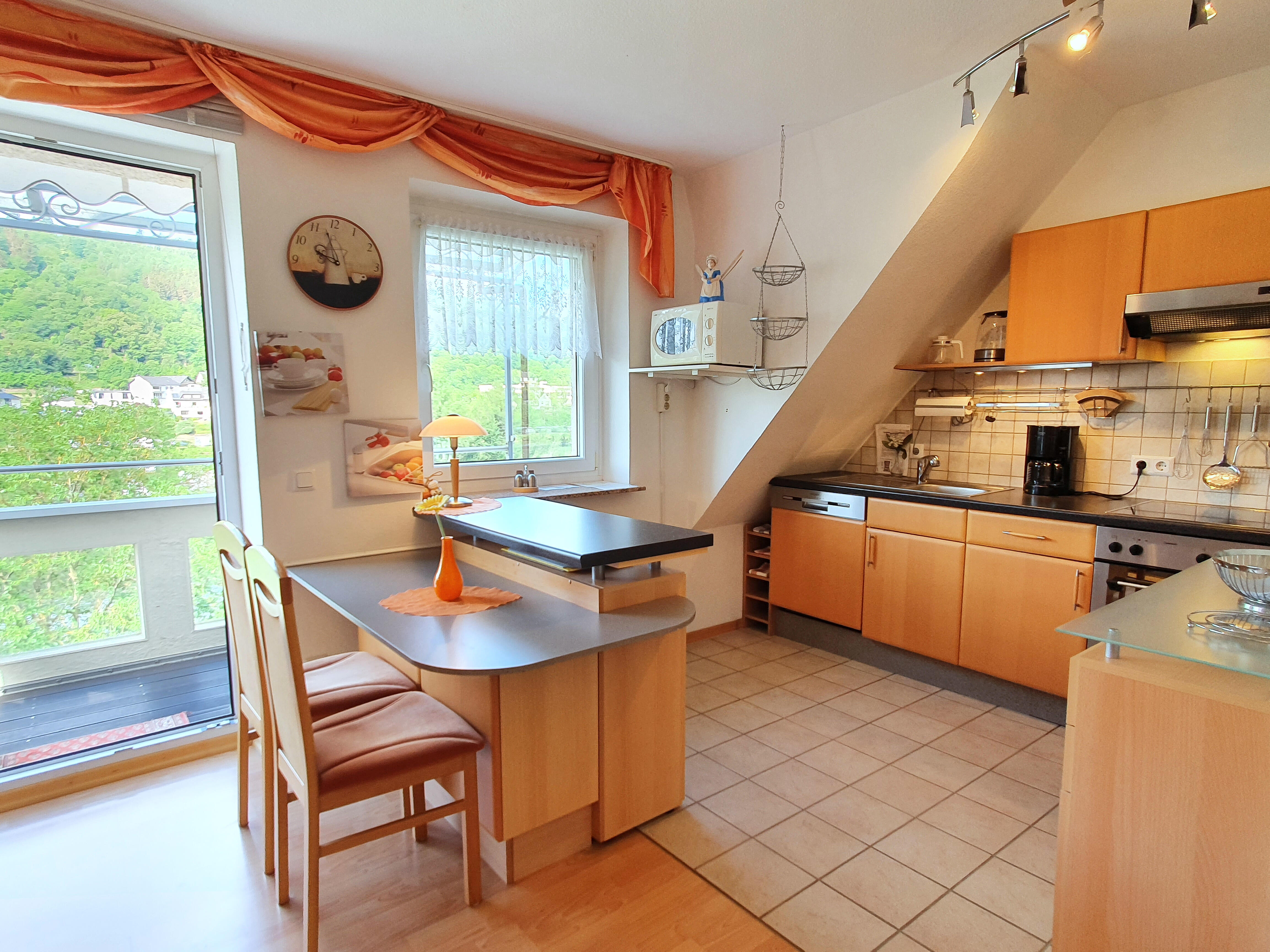 Charmante Ferienwohnungen mit Balkon in malerischer Lage und atemberaubendem Blick auf die Mosel. Der Wohnbereich zur Moselseite ist ausgestattet mit Sat-TV, CD-Player, zwei Sesseln und einer Schlafcouch. Die komplett eingerichtete Küchenzeile verfügt über eine Spülmaschine, einen Herd mit Backofen, eine Mikrowelle und einen Gefrierschrank. Ein Theken-Essplatz bietet Blick auf die Mosel und führt zum geschützten Balkon. Das Schlafzimmer ist mit einem Doppelbett eingerichtet, das kleine Bad bietet Dusche und WC. Ein Kinderbettchen und Hochstuhl sind ebenfalls vorhanden. Kostenloser WLAN-Zugang ist inklusive. Bettwäsche und Handtücher werden gestellt. Ein Unterstellplatz mit Lademöglichkeit für E-Bikes steht zur Verfügung.